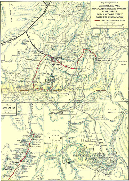 Zion National Park is a roughly quadrangular area of approximately 120 square miles, sixty-four miles by highway from Cedar City, and sixty miles on an air line north of the rim of Grand Canyon. It was set apart as a National Monument under its Indian name, Mukuntuweap, in 1909. In 1919 its area was enlarged, its name was changed to that given it by the Mormon pioneers, and it was made a National Park.