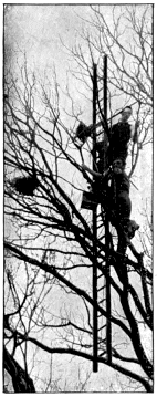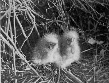 Having concluded from all indications, chief among which was the immense number of huge caterpillars carried in to the young, - 13 - that the latter must be fairly grown, we decided to expose the nest and complete our collection by securing the entire family. So carefully sawing away the front wall of the cavity with a keyhole saw carried for just such purposes, we gave the little fellows within their first view of the outside world. I fear they must have thought the manner of opening their second shell a rather rude one, and the outlook somewhat forbidding. They were pretty little youngsters, fully grown, with clean, jaunty coats, and a grown-up 'chickadee-dee,' just like the old folks. Though somewhat dazzled at first by the sudden flood of bright sunlight, they were, after a little coaxing, induced to sit out on the veranda that had been improvised for them; but, like youthful sitters generally, they were hard to pose, and after many exposures, we succeeded in getting no more than two of them at once. The prettiest one of all, showing two of the little fellows as they finally settled down contentedly in the warm sunshine, was obtained at the expense of much patient effort and a great deal of slushing back and forth in mud and water between boat and camera, and it was gratifying to find that one at least of the negatives did fair justice to the situation.
