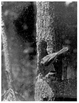 CHICKADEE AT NEST-HOLE, WITH FOOD FOR YOUNG