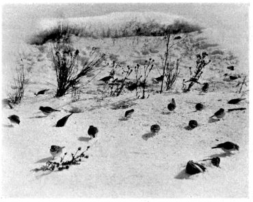 By throwing oats on only one spot, and that close to the window, I soon gathered quite a flock of Horned Larks, who came regularly every morning to feed from the constantly replenished supply. Finally, after a week of gloomy, dark weather, a cloudless sky offered especially good chances for a photograph of my feathered friends. This time I placed the camera on the window-sill. Maneuvers attendant upon focusing and inserting a plate-holder, of course, - 16 - frightened the birds away. They were back again within a few minutes, but an unexpected source of annoyance interfered. A freight train stopped opposite the scene of my operations and belched great billows of smoke between the sun and the birds. Also the shadow of the cabin was gradually encroaching on the feeding ground. I made a trial exposure, however, and obtained a very good negative. But a shadow in the foreground and a wagon tongue in the rear, did not add to the pictorial effect of the group.