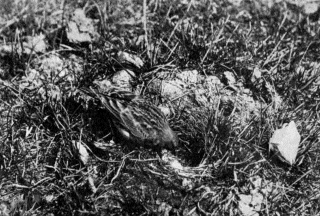 A single experiment taught me the inadvisability of leaving the camera exposed for any length of time to these conditions. I had been trying to get a large photograph of Horned Larks. The camera was placed on the ground and a handful of oats scattered before it, while I waited within the cabin for nearly two hours for an opportunity to pull the thread attached to the camera shutter. But the birds persistently avoided the pebble marking the focal plane, and clouds continually obscured the sun when I wished to make an exposure. At last the right moment came, I pulled the thread, and hurried out to get the result. That plate was never developed. Snow had clogged the shutter, and I found it had remained wide open after being sprung.