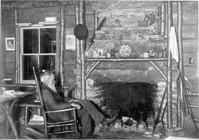This is 'Slab Sides,' a dwelling of Mr. Burroughs' own planning, and, in part, construction, its outer covering of rough sawn slabs, which still retain their bark, being the origin of its name. In a future number we hope to present a photograph of the exterior of Slab Sides, with an account of the birds its owner finds about it. Part of its interior is well shown by our photograph of Mr. Burroughs seated before the fireplace, in which, as head mason and stone-cutter, he takes a justifiable pride. Here, from April to November, Mr. Burroughs makes his home, and here his most sympathetic readers may imagine him amid surroundings which are in keeping with the character of his writings.