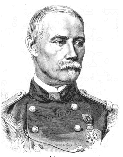 Le général Pourcet, commissaire spécial du gouvernement près le conseil de guerre appelé à juger le maréchal Bazaine, porte gaillardement ses soixante automnes. La moustache et les cheveux sont blancs, mais bien fournis et bien plantés; la chevelure est fine et soyeuse, la moustache et la mouche coupées court, selon l'ordonnance. Les traits du visage sont d'une grande ténuité, seul le front a un certain développement; la bouche, le nez, les yeux vifs et noirs sont petits. Le teint indique que le général a été brun; sa taille est un peu au-dessous de la moyenne des officiers; mais avec sa tournure droite et élancée, le général n'en a pas moins fort bon air en uniforme. Dans sa jeunesse, avec sa figure fine et distinguée, il a dû passer pour fort joli garçon.