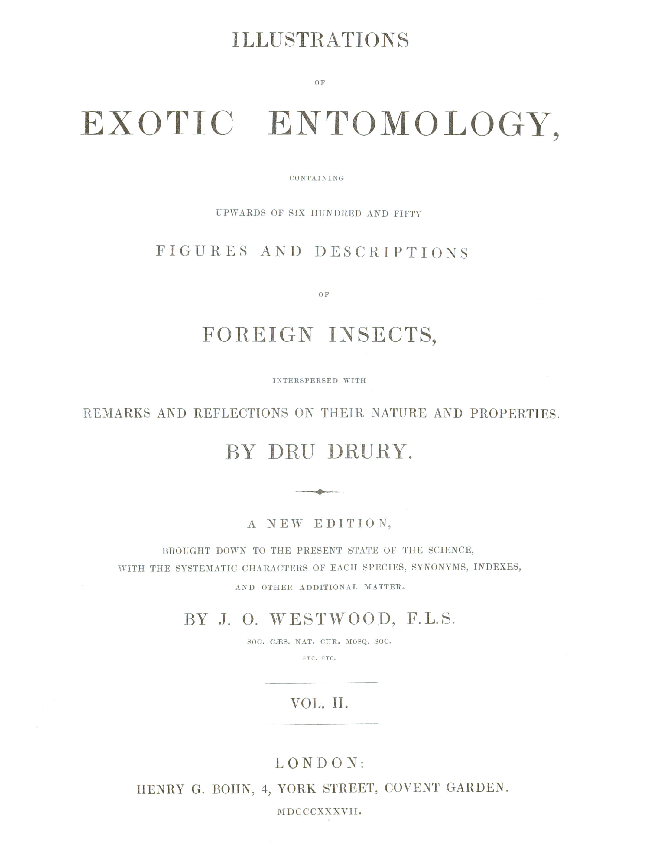 The objection made of the want of names to the insects contained in my first volume, the reader will here find removed; and trivial as well as generical ones, given to every insect in the whole work: and likewise a few errors of the press corrected, that have almost imperceptibly got in. I was, indeed, truly sensible of the defect and incompleteness of that volume, occasioned by the above circumstance, and would gladly have named every insect then delineated; but the different opinions subsisting at that time among entomologists, some preferring one author and some another, made me exceeding cautious of entering on that business: and I rather chose to defer it to the present opportunity, than give occasion for any reflections against me, for my attachment to an author, whose method I should certainly have pursued, and whose works have deservedly entitled him to the appellation of father of natural history. I mean the excellent Linneus, whose system seems now to be generally approved and followed; and I must here mention, the opportunity that the present work affords of giving an explanation of the terms, &c. in his work, I should certainly have availed myself of, for the benefit of the young beginner; but as my friend, Mr. Curtis, has published a good translation of the "Fundamenta Entomologiæ" of that author, wherein the young student, as well as the adept, who are not versed in the Latin tongue, may receive great improvement; I must refer them to that work for the properly understanding the plan and design of that great author.