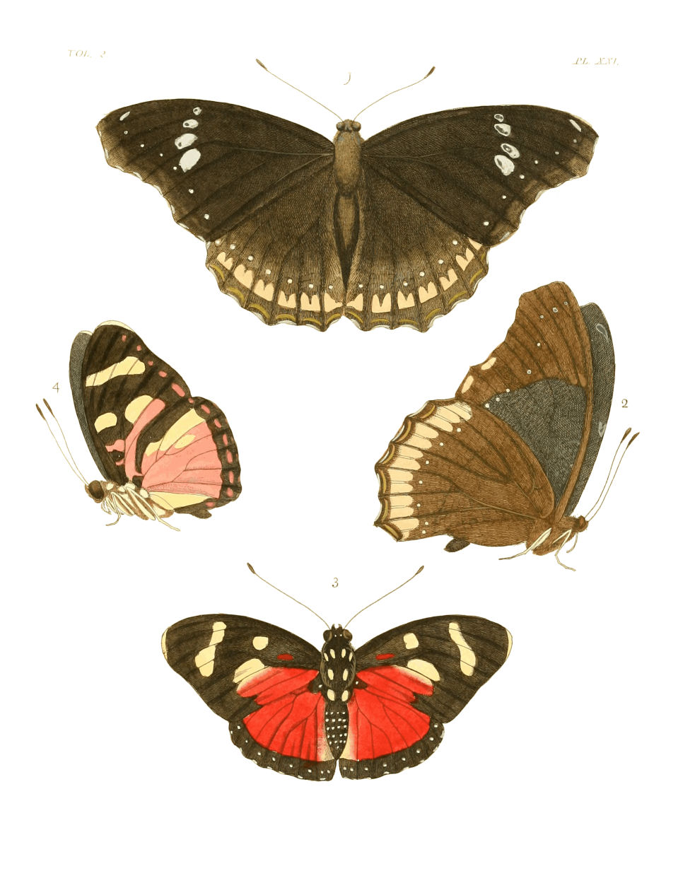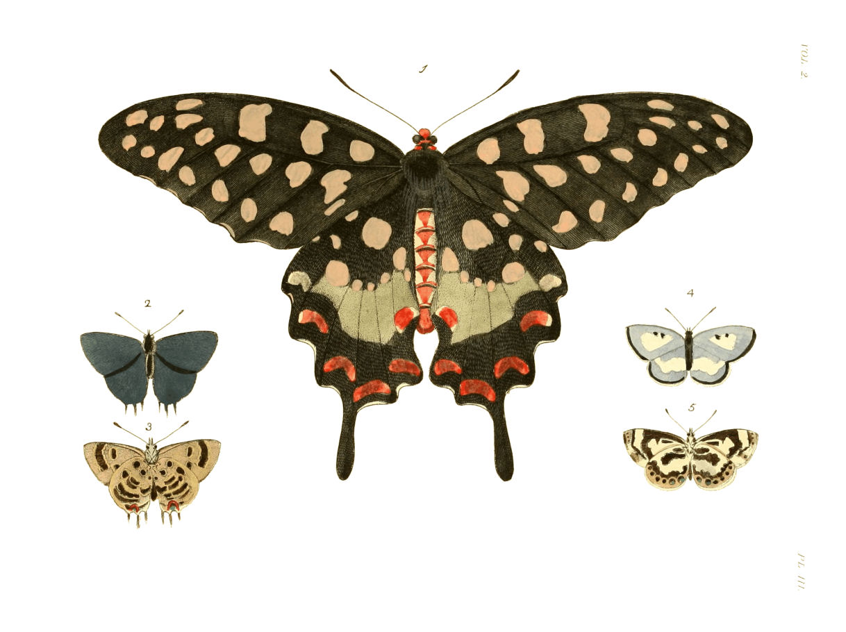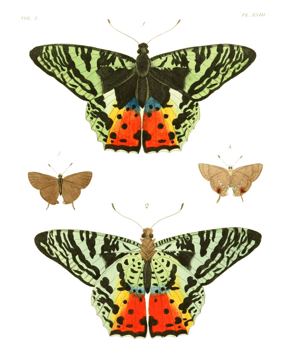 Upper Side. Antennæ red brown, but thickening gradually to the tips. Head fine scarlet. Thorax velvety black. Abdomen white with scarlet rings. Anterior wings black, with three rows of cream-coloured spots on each; the two upper ones next the anterior edge being a little confused by running into each other; the lower one, running parallel with the external margin, is more regular. These spots, being nineteen in number, are of different sizes and shapes; some being round, some oval, triangular, &c. Posterior wings black, with two tails; having four rather broad scarlet crescents placed above {5}each of them, the ends of which are verged with cream. On the middle of each wing is placed a great number of small powder-like spots of a golden green colour; and on the abdominal edges, just below the body, are two scarlet and cream crescents placed opposite each other. The upper part of each wing exhibits ten cream-coloured spots of different shapes and sizes, whereof three are larger than all the rest.