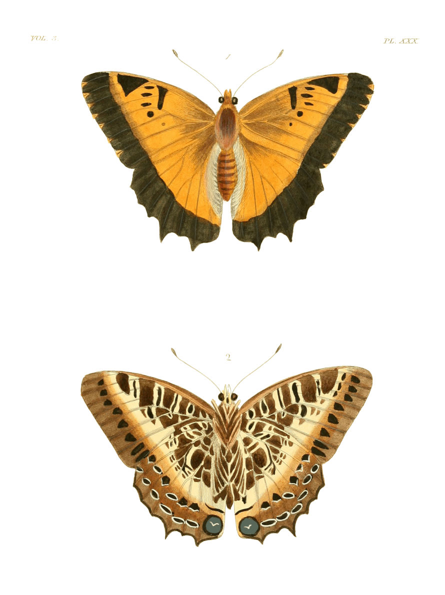Upper Side. Antennæ brown. Head black, with eight whiteish spots on the top. Thorax black, with four white spots at the base of the anterior wings. Abdomen black at the base and at top, clay-coloured on the sides and extremity. Anterior wings black at the base, but at the extremities more of a brown colour, with eighteen different shaped marks and spots; those next the body dark orange, the others yellow clay-coloured, some being so faint as to be hardly discernible. Posterior wings slightly dentated, the inner scollops being edged with clay-coloured crescents. These wings, next the body, are of a dark orange; the remainder clay-coloured, with a broad black border running round each wing, from the upper corners to the abdominal ones; the inner sides being deeply indented, and the outer ones scolloped, with eight roundish black spots near the middle of each wing, one of which is supposed to be hid in the figure.