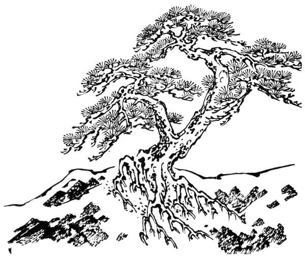 Through long accumulation of traditional methods, the representation of natural features in a garden model has come to be a highly conventional expression, like all Japanese art; and the Japanese garden bears somewhat the same relation to an actual landscape that a painting of a view of Fuji-yama by the wonderful Hokusai does to the actual scene—it is a representation based upon actual and natural forms, but so modified to accord with accepted canons of Japanese art, so full of mysterious symbolism only to be understood by the initiated, so expressed, in a word, in terms of the national artistic conventions, that it costs the Western mind long study to learn to appreciate its full beauty and significance. Suppose, to take a specific example, that in the actual landscape upon which the Japanese gardener chose to model his design, a pine tree grew upon the side of a hill. Upon the side of the corresponding artificial hill in his garden he would therefore plant a pine, but he would not clip and trim its branches to imitate the shape of the original, but rather, satisfied that by so placing it he had gone far enough toward the imitation of nature, he would clip his garden pine to make it correspond, as closely as circumstances might permit, with a conventional ideal pine tree shape (such a typical ideal pine tree is shown in the little drawing on page 25), a shape recognized as the model for a beautiful pine by the artistic conventions of Japan for centuries, and one familiar to every Japanese of any pretensions to culture whatsoever. And, as there are recognized ideal pine tree shapes, there are also ideal mountain shapes, ideal lake shapes, ideal water-fall shapes, ideal stone shapes, and innumerable other such ideal shapes.
