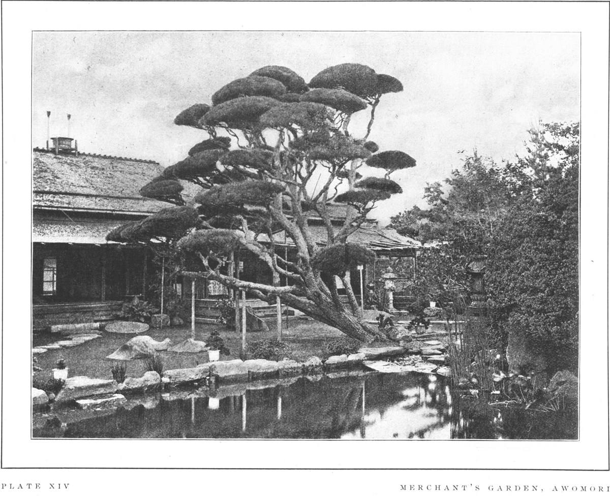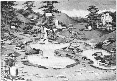 The Japanese garden is not a flower garden, neither is it made for the purpose of cultivating plants. In nine cases out of ten there is nothing in it resembling a flower-bed. Some gardens may contain scarcely a sprig of green; some (although these are exceptional) have nothing green at all and consist entirely of rocks, pebbles and sand. Neither does the Japanese garden require any fixed allowance of space; it may cover one or many acres, it may be only ten feet square; it may, in extreme cases, be much less, and be contained in a curiously shaped, shallow, carved box set in a veranda, in which are created tiny hills, microscopic ponds and rivulets spanned by tiny humped bridges, while queer wee plants represent trees, and curiously formed pebbles stand for rocks. But on whatever scale, all true Japanese gardening is landscape gardening; that is to say, it is a living model of an actual Japanese landscape.
