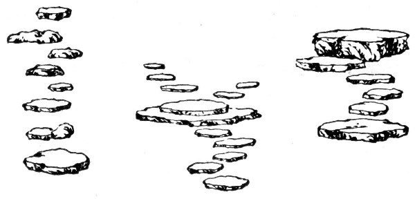 Important accessories in the Japanese garden are Stepping-Stones. Turf is not used in the open spaces, but these are spread with sand, either pounded smooth or raked into elaborate patterns. This sand, kept damp at all times, presents a cool and fresh surface, and to preserve its smoothness, which the marks of the Japanese wooden clogs would sadly mar, a pathway is invariably constructed across such areas with stones called "stepping-stones," or "flying stones" as they are occasionally termed, on account of the supposed resemblance in their composition to the order taken by a flight of birds. In the simpler and smaller gardens such stones form one of the principal features of the design. As nothing could be less artistic than a formal arrangement of stones at regular intervals, not to speak of the difficulty of keeping one's balance while walking upon them, the Japanese gardener therefore uses certain special stones and combinations having definite shapes and dimensions, the whole being arranged with a studied irregularity. The sketch on this page exhibits three typical arrangements. The left hand group shows stepping-stones as arranged to lead from a tea room. The centre group shows stepping-stones combined with a "pedestal stone" which marks the point from which a typical cross view in the garden is to be observed. The right hand group shows the stones near a veranda with a "shoe-removing" stone terminating the series.