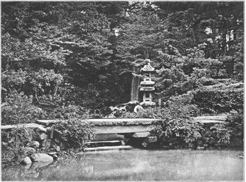 "Tea Gardens" are divided into outer and inner inclosures separated by a rustic fence. The outermost inclosure contains a main entrance gate, and behind this there is often a small building in which it is sometimes the custom to change the clothing before attending the ceremony. The outer inclosure also contains a picturesque open arbor, called the "Waiting Shed," which plays an important part in tea ceremonies, for here the guests adjourn at stated intervals to allow of fresh preparations being made in the tiny tea room. The tea room is entered from the garden through a low door, about two and one-half feet square, placed in the outer wall and raised two feet from the ground, through which the guests are obliged to pass in a bending posture indicative of humility and respect. The rustic well forms an important feature of the inner garden, as do the principal lantern and the water-basin. A portion of the inner inclosure of a "Tea Garden" in the Tamagawa, or Winding-river style, showing the stream, bridge, lantern, water-basin, and an arrangement of stones, including the indispensable "Guardian Stone," is represented in the drawing on this page. All these separate features are connected, according to very rigid principles, by stepping-stones which make meandering routes between them, and form the skeleton of the whole design.