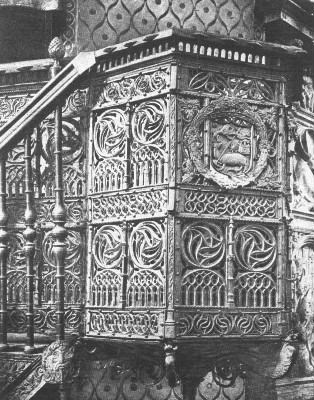 Iron pulpits, so rare elsewhere, have been made in Spain with great success. The one here illustrated shows a mixture [Pg 45]of Gothic and Renaissance detail, but the whole is of contemporary workmanship, and presents an interesting example of the transitional style. The primitive method of working through thin plates superimposed to form tracery is here adhered to, and the whole is applied to a wooden framework. The pulpit was originally gilt. It dates from the end of the fifteenth century, and shows the influence of the Flemish masters who at about that period set so many fashions in Burgos and its vicinity. The wrought-iron screen (shown on page 47), now preserved in the collection of the Louvre, belongs to the same time, and is of the same style of workmanship.
