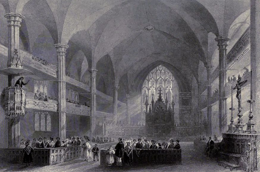 Of the public edifices, the new catholic cathedral, completed in 1829, is undoubtedly the most splendid, and is, in fact, superior to any other in British America. Its style is a species of Gothic; it is 255 feet 6 inches in length, and 134 feet 6 inches in breadth. The flanks rise 61 feet above the terrace, and there are six towers, of which the three belonging to the main front are 220 feet high. It is faced with excellent stone, and roofed with tin. The principal window is 64 feet in height, and 32 broad. On the roof has been formed a promenade, 76 feet by 20, elevated 120 feet, and commanding a most delightful view. The interior contains 1244 pews, equal to the accommodation of at least 10,000 persons. There are five public and three private entrances to the first floor, and four to the galleries, so disposed that this vast congregation can easily assemble and disperse in a few minutes. The building comprises seven chapels, all visible from the front entrance, and nine spacious aisles. The high altar bears a resemblance to that at St. Peter’s at Rome, the pulpit to that of the cathedral at Strasburg. The large window is painted, but not in good style; it is intended that it shall be filled hereafter with stained glass. The other catholic edifices belong mostly to the order of St. Sulpice, by whose members, as formerly mentioned, Montreal was chiefly founded, and who hold the superiority of the whole island upon which it stands. Their seminary, which is a large and commodious building adjoining the cathedral, occupies three sides of a square, 132 feet long by 90 deep, and is surrounded by spacious gardens. To extend its benefits, the order have lately, at an expense of 10,000l., erected a handsome additional building, 210 feet by 45. In these establishments, the numerous students, attending all the branches of learning and philosophy, are taught at very moderate charges. There are two large nunneries; the principal one, called the Congregation of Notre Dame, contains a superior and sixty sisters, who receive boarders at a low rate, and send teachers to different parts of the district. The Sœurs Gris (Grey Sisters) consist of a superior and twenty-four nuns, who admit into their spacious apartments the infirm poor, and are said to treat them with great humanity. The Hôtel Dieu is a large conventual structure, occupied by a superior and thirty-six nuns, and is also appropriated to the reception of the sick and indigent. Its utility is limited by the smallness of its funds, notwithstanding occasional grants from the legislature. The Monastery of the Recollets, which occupies extensive grounds at the end of Notre Dame-street, is now demolished, though its church is still used for public worship.