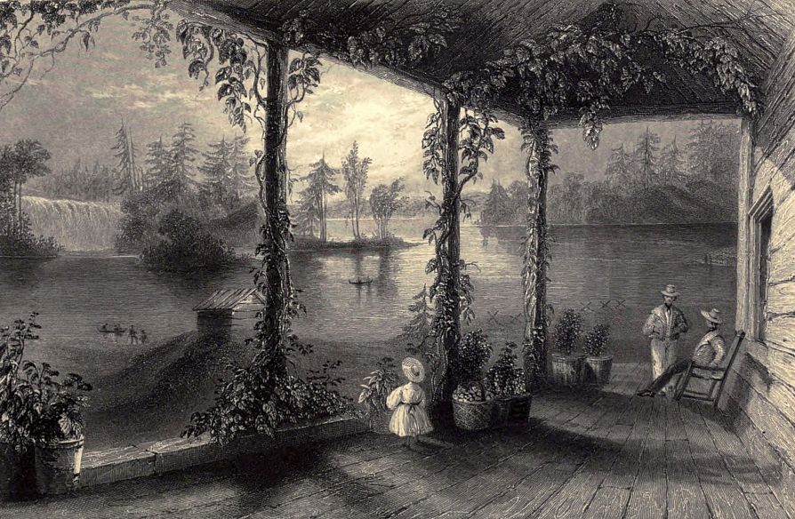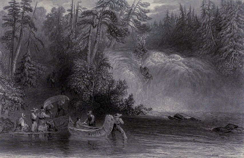 For ten miles downwards the stream is beautifully diversified by wooded islands, through which it rushes with various degrees of violence. The banks, great part of the way, consist of white marble, somewhat soft and coarse; but farther inland, it is believed, a superior description would be found. At the end of this tract, Bisset’s chantier, a solitary log-house, with a few cleared acres, relieves the eye after the monotony of these vast solitudes; it affords also a welcome asylum to the fur and timber traders. Soon after, the view opens upon the magnificent expanse of the Lake des Chats, about fifteen miles long, studded with richly-wooded islets. On the south are one or two scattered mansions, and particularly Kinnell Lodge, the residence of the Highland chieftain, McNab. The northern side appears uninhabited; yet at a little distance from the beach is the settlement of Clarendon, formed in 1829, and in 1831 containing 257 inhabitants. The township of Bristol, in 1828, presented only a few poor hovels and 31 settlers, which number had, in 1831, increased to 96, and in 1836 to not less than 445. At length the lake suddenly contracts, and the rapids of the Chats, for three miles, dash in violent eddies, amid a labyrinth of islands. They terminate in the Falls des Chats, fifteen or sixteen in number, extending in a curved line across the river, and divided by wooded islands; but only from sixteen to twenty feet high. The northern coast, having a rocky and uneven surface, forms the township of Onslow, which in 1836 had 150 settlers.