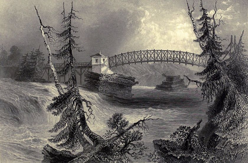About six miles below this point commences Lake Chaudière, an expanse eighteen miles long, and, like the former, terminating in rapids, succeeded by falls. These last, called the Great and Little Chaudière (Kettle), are on a larger scale, 60 feet high and 212 broad. The descending torrent, striking on a great circular rock, is thrown up in clouds of spray, which conceal the bottom of the fall, and often rise in revolving columns high above its summit. A great portion of the water being unaccounted for, is believed to escape through subterraneous channels. Immediately below, where the stream still rolls in rapid eddies, a bridge has been thrown across. The difficulties of the undertaking were overcome by dividing the structure into four parts, consisting of different materials. The broadest span is stretched by means of a hempen fabric, composed of three-inch cables, forming an inverted segment of a circle, the lowest point of which is only seven feet above the torrent. But at no time can it be passed without a feeling of peril.