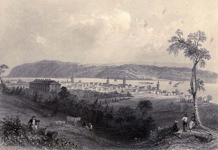 The site of this town does not present those bold and grand features which distinguish the Canadian metropolis, though its beauty can scarcely be surpassed. The river, in this finest part of its course, divides itself into two channels, inclosing an island thirty-two miles long and ten and a half broad, which forms one of the most favoured spots on earth. The soil, everywhere luxuriant, is cultivated like one great garden, to supply the inhabitants with vegetables and fruit. These last are of the finest quality, and the apples especially are said to display that superiority which so remarkably distinguishes them in the New World. Although the island possesses in general that level surface that fits it for a thorough cultivation, yet about a mile and a half north-east rises a hill, 550 feet high, commanding a noble view over the fertile country, which is watered by the several branches and tributaries of the St. Lawrence. Its face is covered with agreeable villas, and its wooded heights form a frequent resort to pleasure parties from the city; but the intention now understood to be entertained of erecting fortifications on its summit, will, if put into execution, banish in a great measure its rural character.