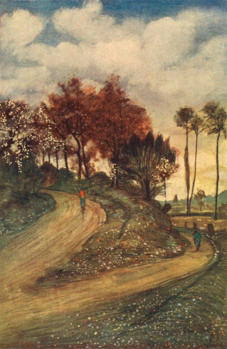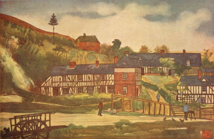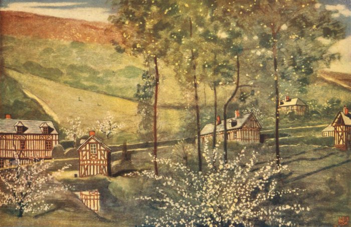 A great deal of Normandy is flat and bare; the flint and trefoil style is common. Wide fields of mustard of a crude raw yellow, not golden like the Pomeranian lupin fields, are often to be seen. The flat landscapes are broken by a few stiff or scraggy trees, tethered cows, or cottages of lathe and clay; yet, we hear the song of the lark and scent the breath of roses, and in the spring and early summer orchards of cherry blossom make gleaming sheets of white on many a roadside.
