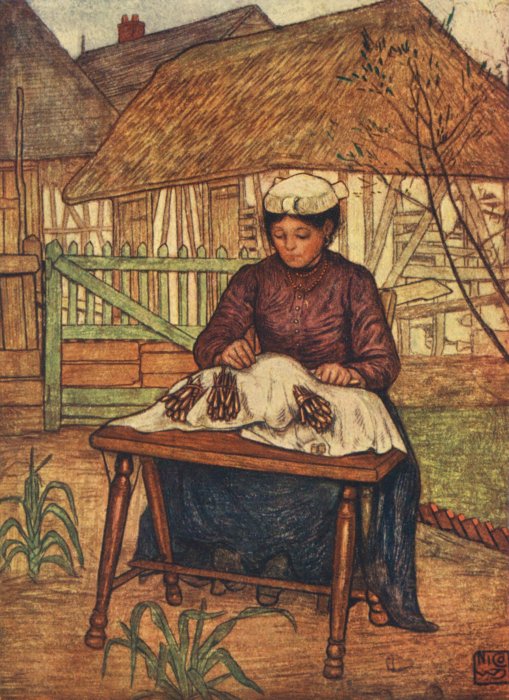 In regard to the people, what there is to say has been said in the various local chapters. The quaint costumes, which are familiar to us from many a10 picture, are fast dying out; in Normandy one sees less of them than in Brittany; here and there, it is true, we find a local fashion in caps, as at Valognes; and still on feast-days and fair-days some damsel appears in the wonderful erection of stiffening and beautiful hand-made lace which her grandmother wore, to be the envy of her neighbours; but in an ordinary way these things are not seen. “On y cherchent vainement ces riches fermiéres de la plaine et du Bessin, dont les hautes coiffes garnies de dentelles et les bijoux Normandes attiraient tous les regards.”