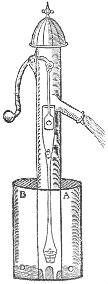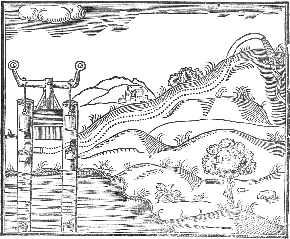 Let there be two hollow posts, with a succur at the bottom of each, also a succur nigh the top of each: let there be fastned unto both these posts a strong peece of timber, having, as it were, a beame or scale pinned in it, and having two handles, at each end one. In the tops of both these hollow posts fasten two brasse barrels, made very even and smooth within, unto these two barrels let there be fitted two forcers, lethered according to art, at the tops of these forcers must be fastned two yrons, which must bee linked unto the aforesaid beam; from each post below towards the end of the barrels, let there bee two leaden pipes, which afterward meet in one, to conduct the water up to the place desired, which if it bee very high, there will be need of some succurs to catch the water as it cometh.