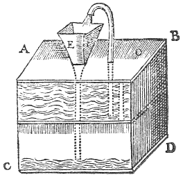 Let A, B, C, D, be a great vessell, having a partition in the middle: let there bee a large tunnell at the top of it, E, F, whose neck must go into the bottom almost of the lower vessell: let there be a hollow pipe also coming out of the partition, and almost touch the top of the upper vessell. In the top of the upper vessell let there bee another pipe, reaching from the bottom of the upper vessell, and extending it selfe out of the vessell a good way: let the top of it hang ouer the tunnell. In the top of the upper vessell let there be a hole besides, to be stopped with cork, or otherwise: when you will use it, open the cork-hole, and fill the upper vessel with water: then stop it close againe, and poure water into the tunnell, and you shall see that the water in the upper vessell will run out of the pipe into the tunnell againe and so will continue running untill all the water in the upper vessell be run out. The reason thereof is this; the water in the tunnell pressing the ayre in the lower vessell, maketh it ascend the pipe in the partition, and presse the water in the upper vessell, which having no other way but the pipe, it runneth out thereat.