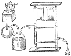 Let there be an altar having a pipe comming out of it, and entring the body of a hollow ball, let there come out of the same ball a crane, whose lower end make to hang ouer a bucket fastned to a rope, and hanging ouer a pulley, of which rope the other end must bee wound about two spindles, hauing two doores fastned unto them, and at the end of the same rope let there bee a waight fastned. So the fire on the altar will cause the water to distill out of the ball into the bucket, which when by reason of the water it is become heuier then the weight, it will draw it up, and so open the said gates or little doores.