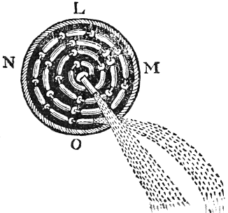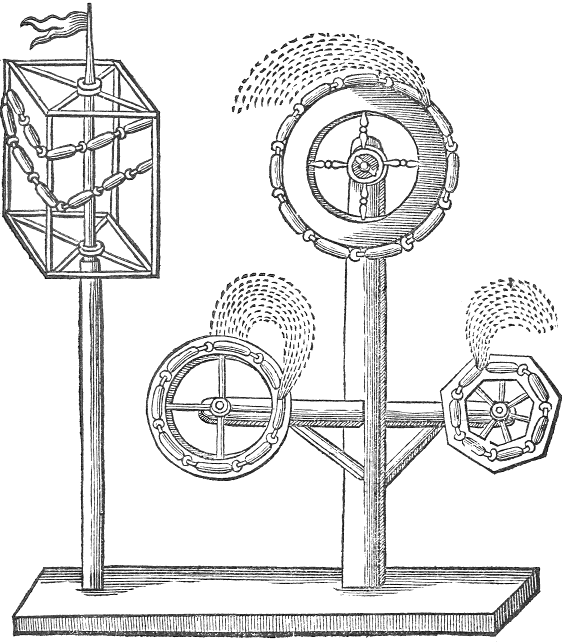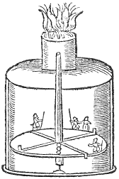 Let there be a round vessell of glasse, or horn, and on the top of it a vessell of brasse, and in the midst a hollow pipe spreading it selfe into foure seuerall branches at the bottom: the ends of two of the branches must turn up, the ends also of two must turn down; upon these foure branches fasten a light cord, with seuerall images set upon it. Rarifie the ayre then by laying a red-hot iron upon the top of the brasse or tin vessell, and it will turn the wheele about, so that you would think the images to bee living creatures.
