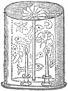 First prepare a round peece of wood, hauing a brasse box in the midst, such as they make to hang the mariners compasse with, but a good deale bigger, round about this peece of wood fasten divers shreds of thin lattin, standing obliquely or ascew, as the figure doth represent; round about these fasten a coffin of thin pastbord, cut into seuerall formes of fishes, birds, beasts, or what you please. Prepare a lantern with oyled parchment, sufficient to conteine it, in the midst of whose bottom must bee erected a spindle with a narrow point, to hang the pastbord cut into formes upon: upon each side let there be a socket for to set a candle in, also let there bee made a doore in the bottom to put the candles in at, and after to be shut, and it is done. If you set two candles in the sockets, the heat of them will turne the whole pastbord of formes round.