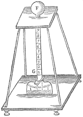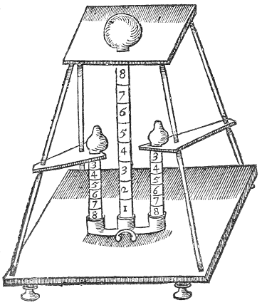Prepare two glasses like unto the figure marked with the letters A, B, the one of them must have a small hole in or about the head thereof. Prepare likewise for the bottom a vessell of the fashion of the figure G, H, having two mouthes, at each end one, also a cocke in the middle, as K: divide then the shank of the glasse without the hole in the top, into equall parts, and set figures upon it: next lute them both fast into the necks of the bottom vessell. (But first remember to put them in a frame:) when the cement is dry turn the cock of the bottom vessell, and rarify the ayre in the glasse that hath no hole at the top; then set the bottom vessell a little way into a vessell filled with water, and it will suck up the water as it cooleth, when the bottom vessell is full, also the water mounted in that top glasse without a vent, up to a fitting degree; (the temper of the weather regarded) then depresse (but gently) the glasses into the vessell of water, untill the water be come up into the glasse with the vent at the top sufficiently, that is, so that in both the glasses may bee contained so much water as will fill the shank of one, and about 2 or 3 degrees of the other; then turne the cock, and take away the vessell of water from under them, let them down, and fasten the bottom vessell unto the bottom of the frame, and make a rock about it, or else what other works you please, that the art may not be discerned. Lastly, set figures upon both, but first upon that without the vent, beginning from the bottom, and proceeding upwards, then lay your hand upon the head of it, which will depresse the water, which when it commeth equall to the degrees, paste the same degree on the place of the water in the other glasse with the vent, and it is done.