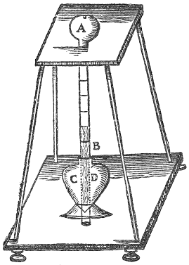 Prepare two glasses after the fashion of the figure A, B, and C, D: let the glasse A, B, haue a small pinhole at or about the top of all, and let the glasse C, D, haue besides the hole at the top, another hole at the bottom with a short pipe. Prouide such a frame for this as you did before for the other; then put the glasses into it, fasten the bottom glasse to the bottom of the frame, hauing a hole at the bottom, thorow which the pipe of the glasse C, D, may passe, fit a cork unto it: then lute the two glasses together, so that no ayre may passe between the joyning; divide then the shank into so many degrees as you please, and figure it as before I taught you, then with the heat of a candle, rarifie the ayre in the glasse C, D, and fill it a third part full of water, and then put the cork fast in. Note that if the first heating of the glasse rayse not the water unto your content, you must repeat it over and over, untill it doe: when it is sufficient, then stop the cork in very firm, that no water may come out, and it is made.