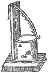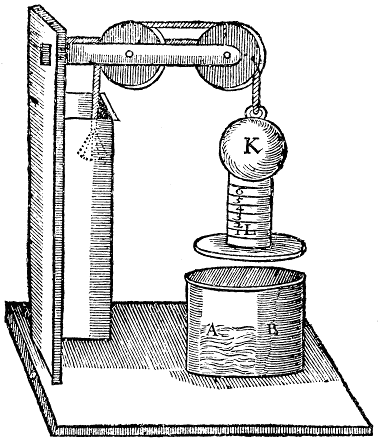 First prepare the glasse A, B, fill it almost top-full of water, provide also the glasse K, L, having a loop at the top of it: divide it into so many equall parts as you would haue degrees, and on the mouth thereof fasten a thin board, that will easily slip in and out of the bottom glasse, make then a waight of lead or brasse somewhat heavier than both the glasse and board fastned thereto; and then tie a little rope to the loop of the glasse A, B, and the waight at the other end thereof. Rarify the ayre contained in the glasse L, and reverse it into the glasse A, B, filled with water, and hang the plummet over two little pulleys fastned in a frame made for the purpose, and as the glasse K, L, cooleth, the water will ascend the same, and so by the change of the outward both the glasse and water will move accordingly.