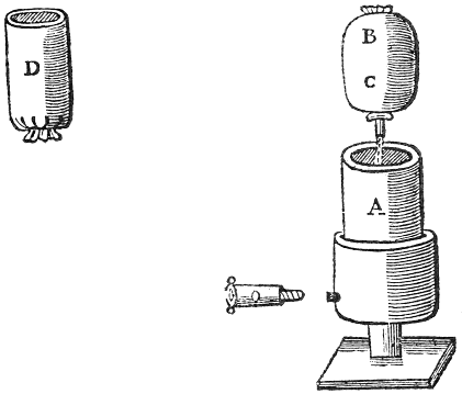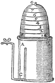 Let A, B, C, D, be the foot, at each end whereof, place a vessell equall in bignesse, the one to the other; as D, E; also let there passe a hollow cane from the one to the other, as A, R, A, the ends whereof must almost touch the tops of the sayde vessels; in the vessell D, there must bee a hollow pipe, as F, whereby you may by help of a tunnel powr water into the vessell: also in the vessell E, there must be a crane, as G; now if you fill the vessel E with wine almost unto the top of the crane, and afterwards stoppe the mouth of the vessell, that the ayre may not breath foorth, it will not run of it selfe: but if you put water into the vessell D, the ayre contayned in it, will passe through the hollow pipe, A, R, A, into the vessel E, where striving for a greater quantity of roome, it presseth the wine out of the vessell E, (by the crane) answerable in quantity unto the water powred into the vessell D.