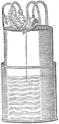 Prepare a cestern having within on the lid fastned a concave hemisphere, in whose bottom let there bee made one or two holes: let there also be a hole in the top of the sayd cestern, whereby it may bee filled with water as occasion serveth. Also let there bee made to stand on the top of this cestern the image of a man holding unto his mouth a trumpet: this image must likewise have a slender pipe coming out of the cestern unto the trumpet, in this pipe or cane there must be a cock, nigh unto the cestern. Also there must come out of the concave hemisphere at the side of the cestern, a little short pipe, having a clack on it within the vessell. Fill the cestern about two thirds full of water, and then cork it up fast, blow then into the vessell at the pipe on the side divers times, and the ayer will force the water out of the hemisphere, and make it rise up on the sides of it; turne then the cock, and the weight of the water will force the ayer out of the pipe, and so cause the trumpet to sound.
