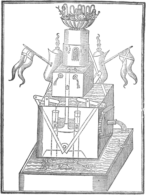 Provide a cestern, having a tunnell at the one end of the top, and a little cane coming out of the other end of the vessell; on the top of which let there be a bird made to sit, also at the bottom of the cestern, let there bee a crane to carry away the water as it runneth into the vessell. Place this vessell with its tunnell under the fall of a conduit of water, and the bird will sing; and if you hold a cup of water under his bill, hee will drink and make a noise.