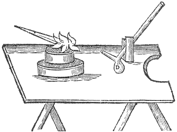Prepare a cestern having an altar of brasse or tin upon it, let there be in the cestern a hollow pipe turning up out of the cestern at each end; also in the middle within the altar, also on the side of the altar into the body of a dragon artificially made, with a reed in the mouth of it. Let there bee two boxes at the tops of the pipes, on the ends of the cestern, having two crooked pipes or cranes comming out of them. Fill the boxes with water when you occupy it, also put fire upon the altar, and the dragon will hisse, and the water in the two boxes being wrought upon by the heat of the fire comming thorow the pipes, will drop into the fire. These two boxes ought to be inclosed in the bodies of two images, and the two short cranes comming out of them in her armes and hands.