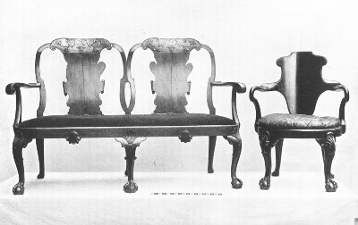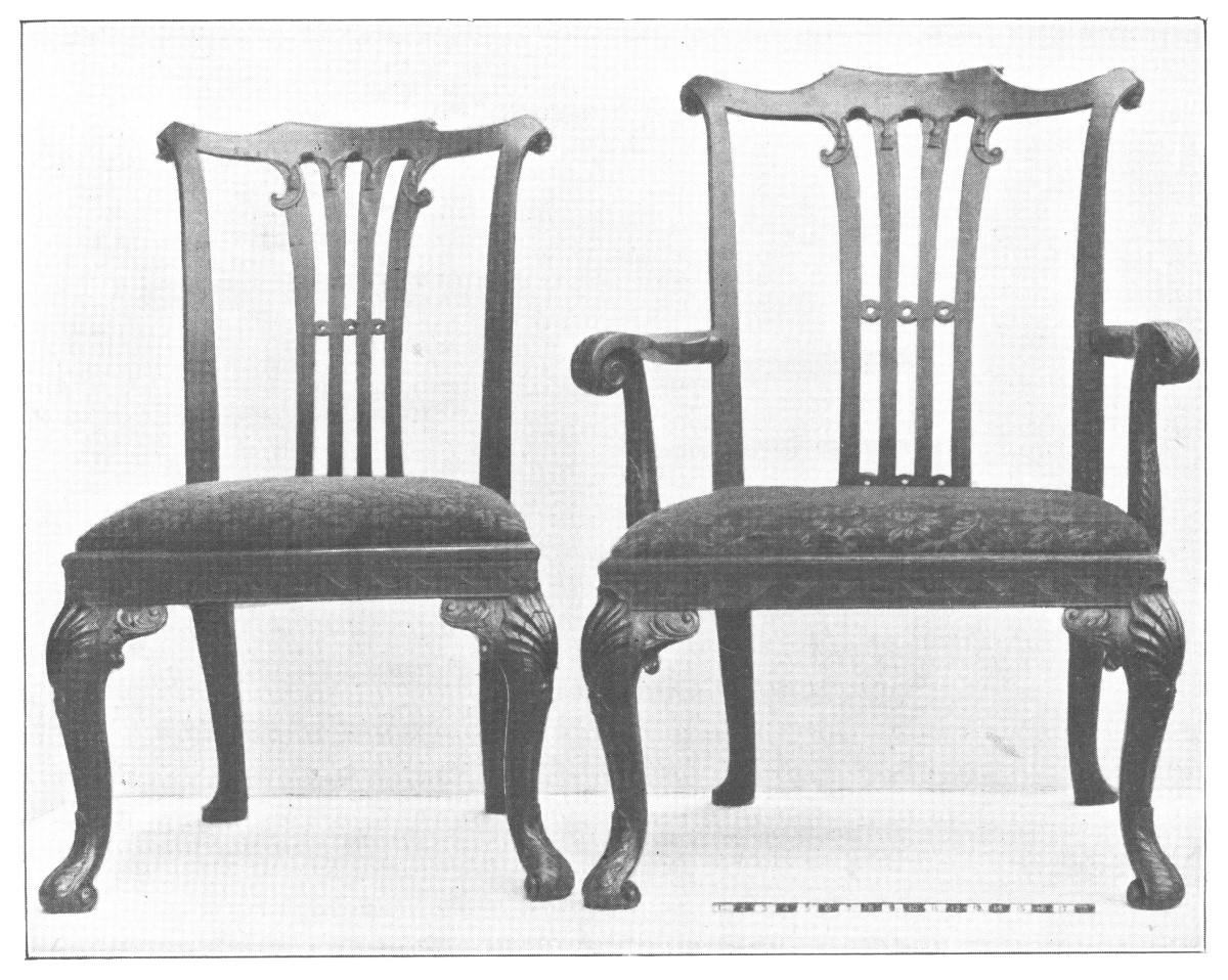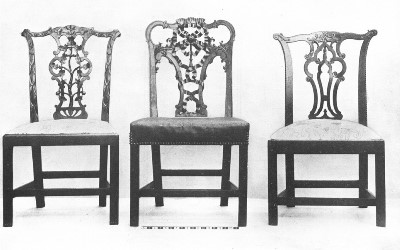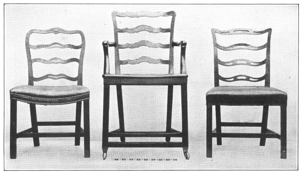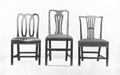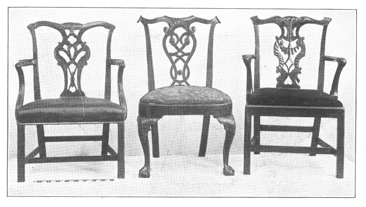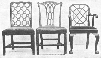 The chairs chosen for illustration in this number are of the simpler patterns. It will be seen that they have very little ornament, and that this is almost entirely confined to the backs, the legs being in most cases square and plain. In the backs the same lines occur as in those made in the time of William III., but instead of the frame of the back being covered with silk, tapestry or other material, Chippendale's are cut open with fanciful patterns. Those with cabriole legs usually have claw feet and a shell or leaf at the top. The chairs in Chippendale's book are much more elaborate than those here illustrated or than those he ordinarily produced. This is naturally accounted for by the desire to induce customers to purchase the more expensive pieces. The simple square leg without taper is one of the distinctive marks of Chippendale's time. Later in the century, in the work of Hepplewhite and others, the legs were made more tapering and the whole chair much lighter and more elaborately ornamented to correspond with the Renaissance forms then in vogue. The turned leg is rarely found, although much used later. The shaping and ornamentation is generally confined to the front legs. Mahogany, as has been stated, was the wood most used, and the ornamentation was confined as a rule to carving. Inlay and marquetry, brass and ormolu were employed on other articles of furniture, but the chairs rarely have such ornament.