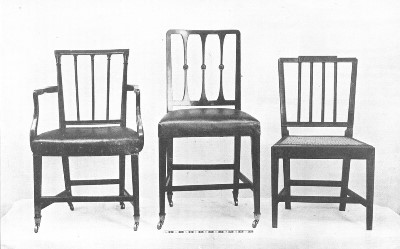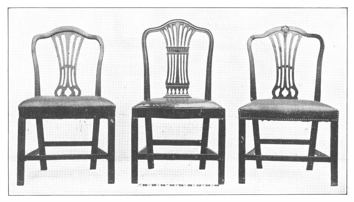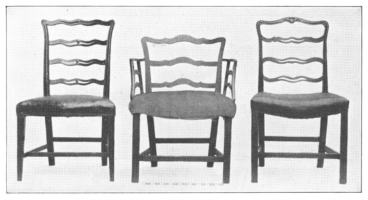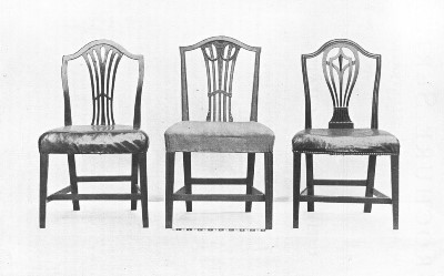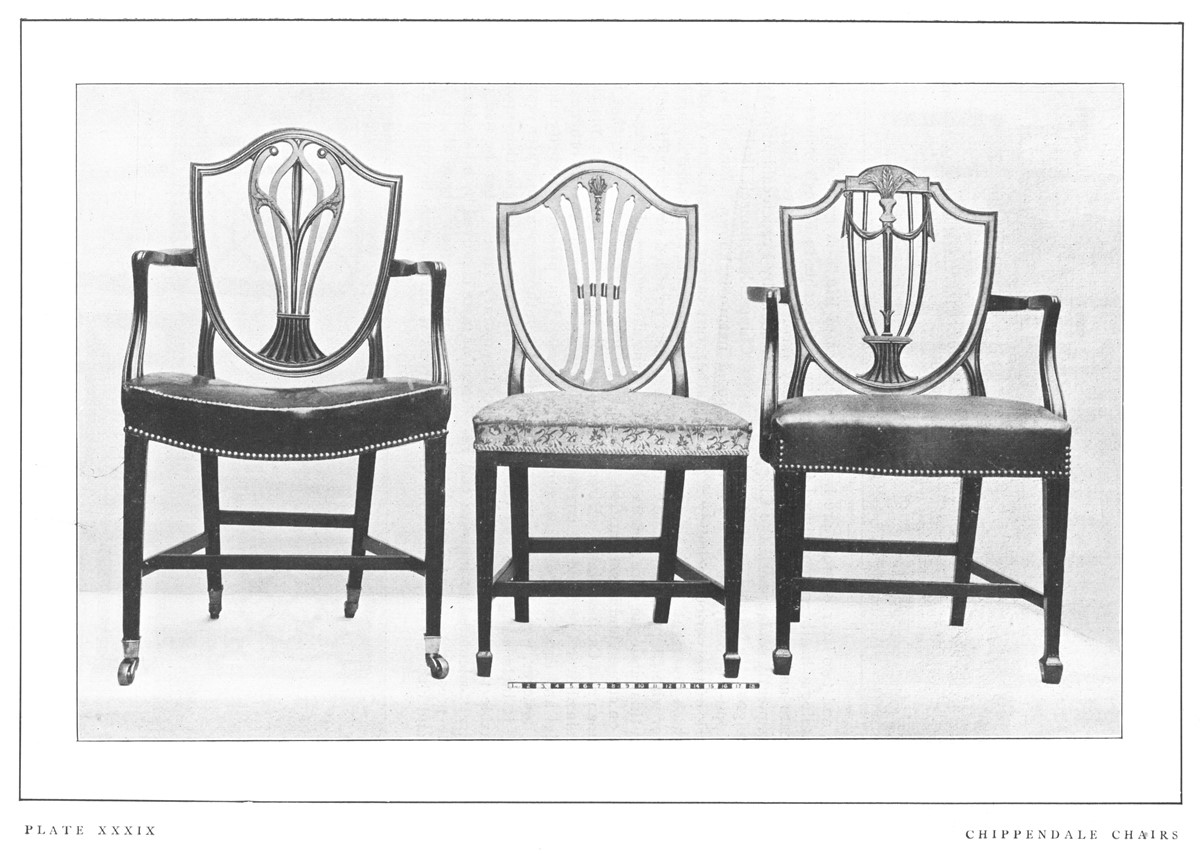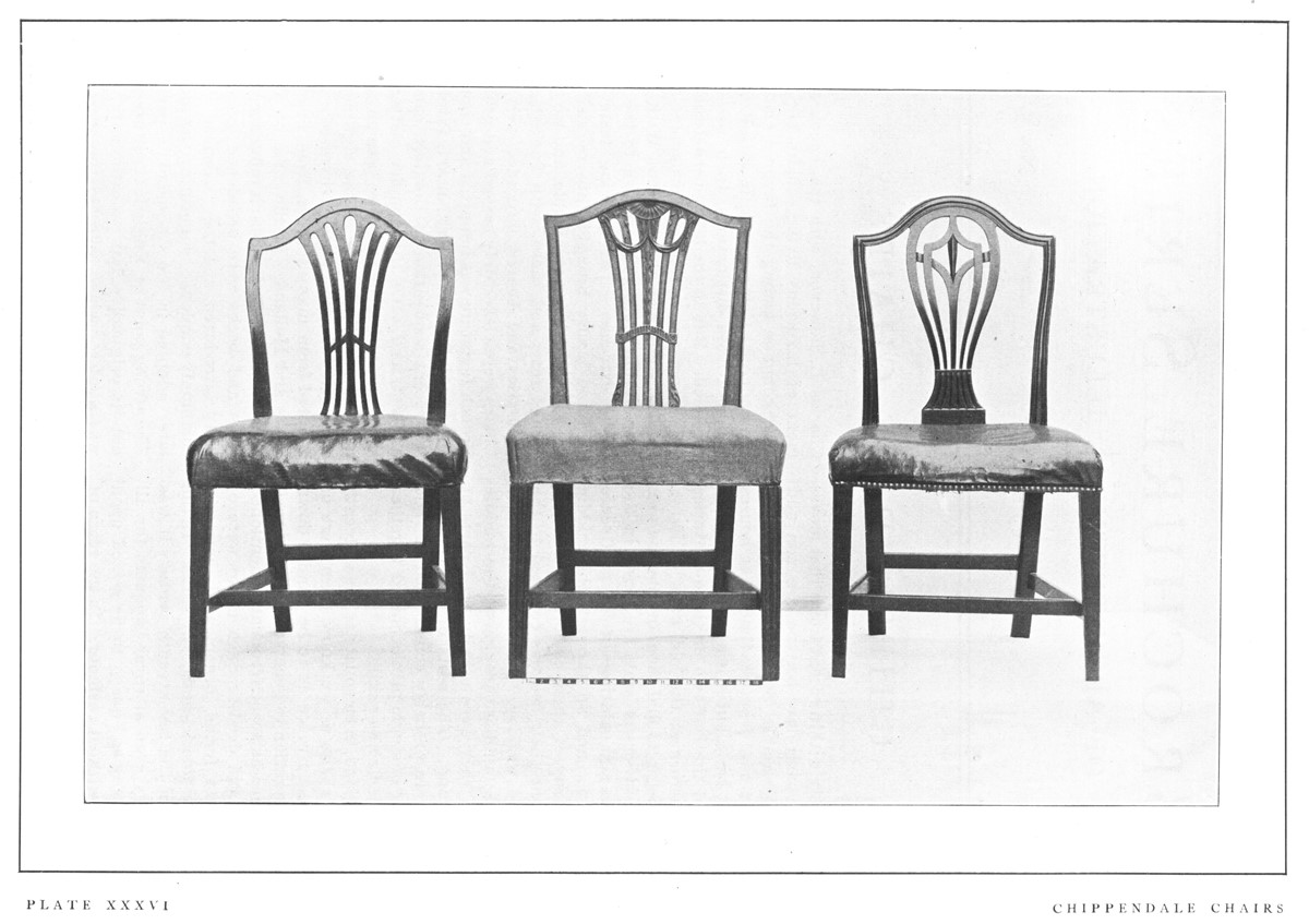The chairs chosen for illustration in this number are of the simpler patterns. It will be seen that they have very little ornament, and that this is almost entirely confined to the backs, the legs being in most cases square and plain. In the backs the same lines occur as in those made in the time of William III., but instead of the frame of the back being covered with silk, tapestry or other material, Chippendale's are cut open with fanciful patterns. Those with cabriole legs usually have claw feet and a shell or leaf at the top. The chairs in Chippendale's book are much more elaborate than those here illustrated or than those he ordinarily produced. This is naturally accounted for by the desire to induce customers to purchase the more expensive pieces. The simple square leg without taper is one of the distinctive marks of Chippendale's time. Later in the century, in the work of Hepplewhite and others, the legs were made more tapering and the whole chair much lighter and more elaborately ornamented to correspond with the Renaissance forms then in vogue. The turned leg is rarely found, although much used later. The shaping and ornamentation is generally confined to the front legs. Mahogany, as has been stated, was the wood most used, and the ornamentation was confined as a rule to carving. Inlay and marquetry, brass and ormolu were employed on other articles of furniture, but the chairs rarely have such ornament.