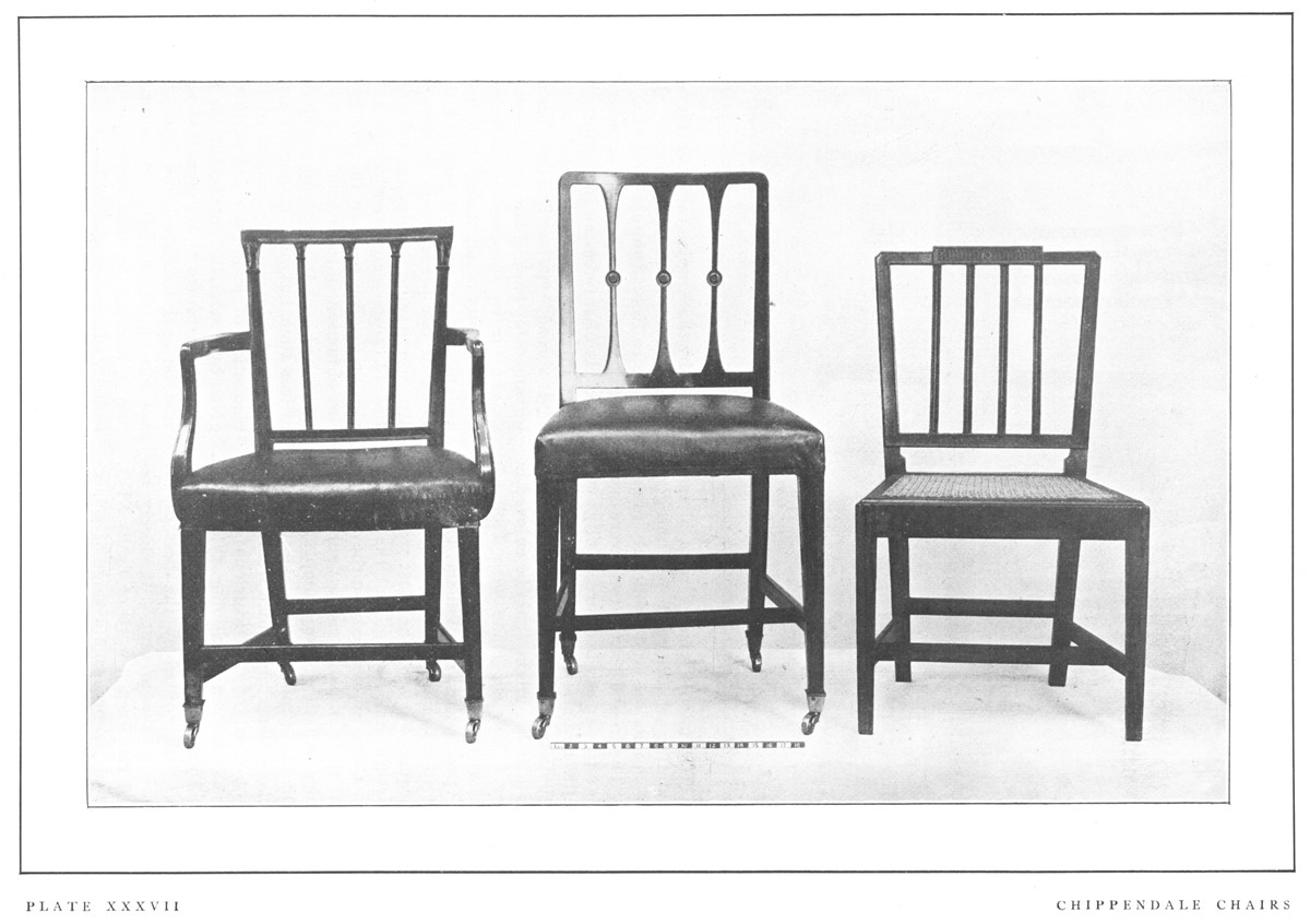 Mr. K. Warren Clouston, describing the work of this period (The Architectural Record, Vol. VIII.), says: "Chippendale, above all things, was a chairmaker, and his chairs are full of variety, at first with the high back, cabriole leg and claw-and-ball foot of the so-called Dutch taste; then rising to lighter fancies, either with vase-shaped ornament, flowing ribbon bows, interlacing frets of Gothic tracery. But what matters it whether the rococo ornament then prevailing on the continent, the Chinese leanings of Sir William Chambers, or Strawberry Hill Gothic were adopted, when the different sources are blended in one harmonious whole? We give Chippendale the first place simply from his book, for the squat backs and ungainly chairs of Manwaring and the Society of Upholsterers, and the badly designed seats of Ince and Mayhew only serve to accentuate the work of the master hand."