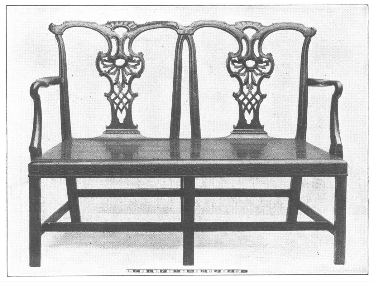 In England, even so late as the sixteenth century, chairs as we know them were of so rare occurrence as to be handed down from generation to generation, and of such importance as to be frequently mentioned in wills and deeds. Such chairs were of the rudest forms, ornamented, however, with embroideries and costly stuffs. In the middle of the seventeenth century it was customary even at royal banquets for all but the king and queen to be seated upon benches without cushions. In the reign of Charles I., however, with the encouragement of luxurious living, chairs became more common among the favored classes, and under the Commonwealth, with its levelling of class distinctions, their use was extended. But in the latter period the revulsion against unnecessary ornament and display simplified the models. With the Restoration there was a return to the opposite extreme. The growing taste for ease and luxury brought into requisition the richest fabrics obtainable, and we find stuffed seats and backs, with Turkish embroideries and heavily brocaded velvets. Chairs were elaborately carved and gilded. French furniture was imported and copied, and the influence of Indian art, through the recent acquisition of Bombay, can be easily traced. Of the simpler patterns, those made of turned spindles became common at the beginning of the eighteenth century. Forms were borrowed and adapted from many sources, from France, Spain and Holland. In the time of William and Mary, under Dutch influence, the seats and backs were broadened, colored inlay introduced, and the "cabriole" legs commonly employed, suggesting the forms later adopted in the Chippendale period. The strong point of English furniture was not its originality, but its catholicity. It was a mirror which reflected the outcome of other times and countries in a frame of its own.