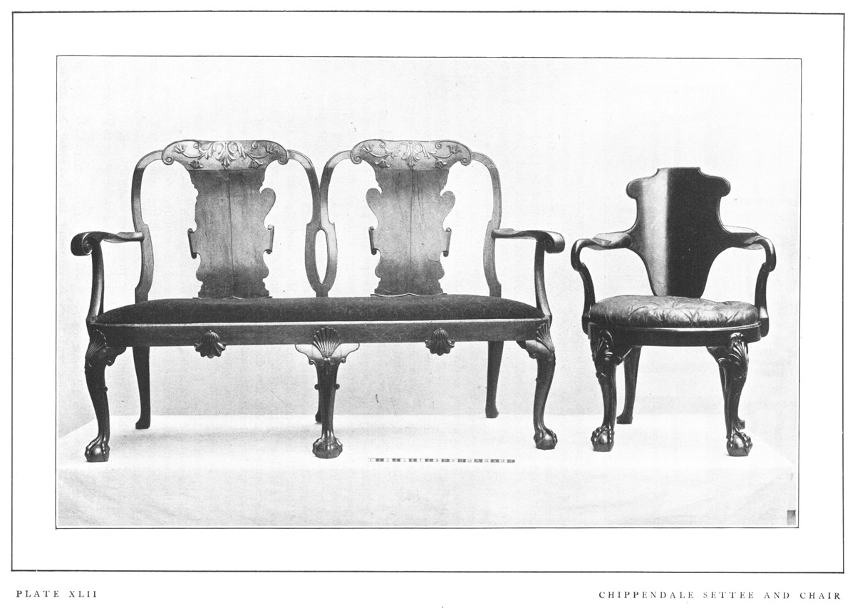 It will probably be a surprise to the reader who has had no occasion to inquire especially into the history of household furniture to know that a century and a half ago furniture makers, in England and elsewhere, resorted to much the same method of securing customers, by publishing illustrated catalogues, as do our own enterprising manufacturers. Among the earliest of these trade catalogues, as we now call them, was that of Thomas Chippendale, the first edition of which was published about 1750 (the exact date is in doubt), and two later editions are known. This catalogue has been reproduced in recent years and many of the plates have been frequently copied, until the Chippendale designs have become familiar, and the name applied broadly but loosely to all of the work of the period, including a great deal which by right has no connection whatever with Chippendale. The illustrations in this catalogue were elaborately engraved on copper, and it was entitled "The Gentleman and Cabinet Maker's Director." It contained over two hundred engravings of useful and decorative designs, some of which, however, were probably never executed. It included designs "in the most fashionable taste" for a great variety of furniture "calculated to improve and refine the present taste, and suited to the fancy and circumstances of persons in all degrees of life." A great deal of the design is traceable to French influence, and may have been borrowed directly from similar books by French cabinet-makers.