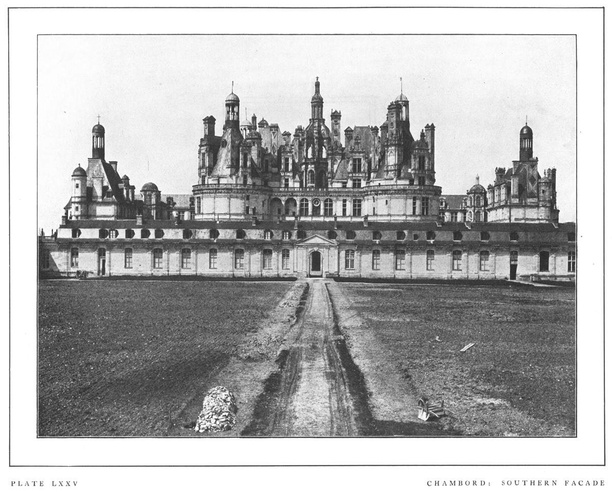 "To destroy the character of Chambord from the outside was not difficult. It was not easy to tame the rude defiance of Vincennes, or give facility to the reserved and guarded approaches of Gaillon. Solid rectangular towers, heavy machicolations, and ponderous drawbridges offer a stubborn resistance to schemes of ruthless innovation; but Chambord was no fortress, it was a country house. The very site is motived by no other reason than the pleasures of the chase. The battlements of Gaillon gave back the echoes of the trumpet, but the galleries of Chambord resounded with the huntsman's bugle.