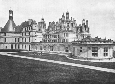 "That sentiment of peculiar charm which is attached to the situation of Chambord will be felt by every artist who visits this strange creation. At the end of a long avenue of poplars breaking through thin underbrush you see, little by little, peeping and mounting upward from the earth, a fairy building, which, rising in the midst of arid sand and heath, produces the most striking and unexpected effect. A jinnee of the Orient, a poet has said, must have stolen it from the country of sunshine to hide it in the country of fog for the amours of a handsome prince. The park in which it is situated is twenty square miles in area, and is surrounded by twenty miles of walls."