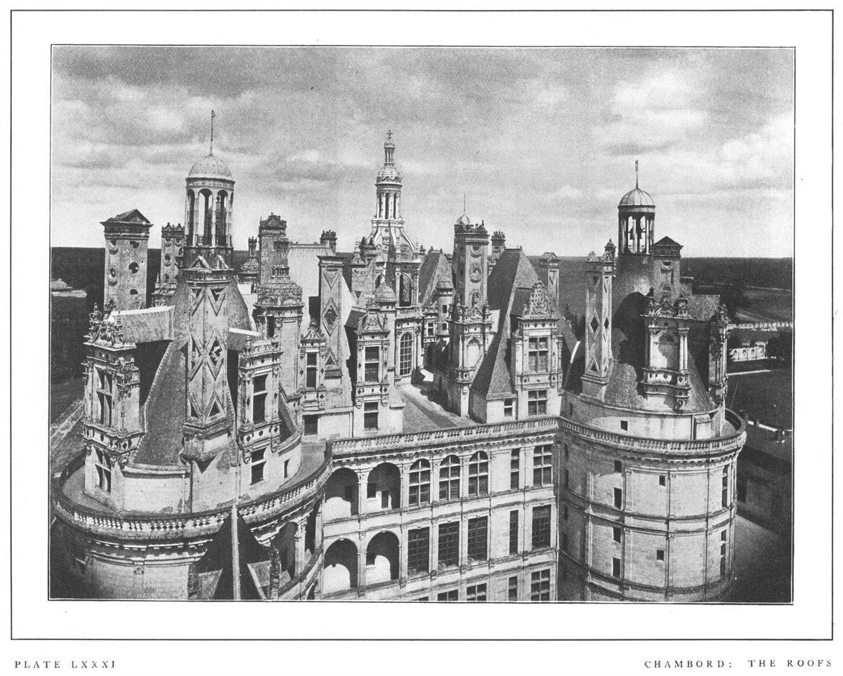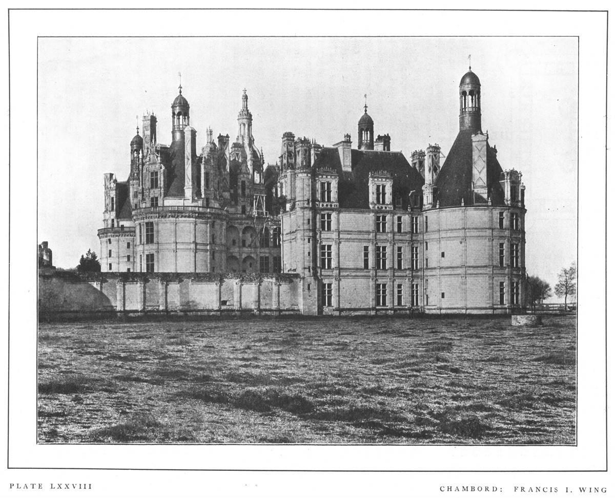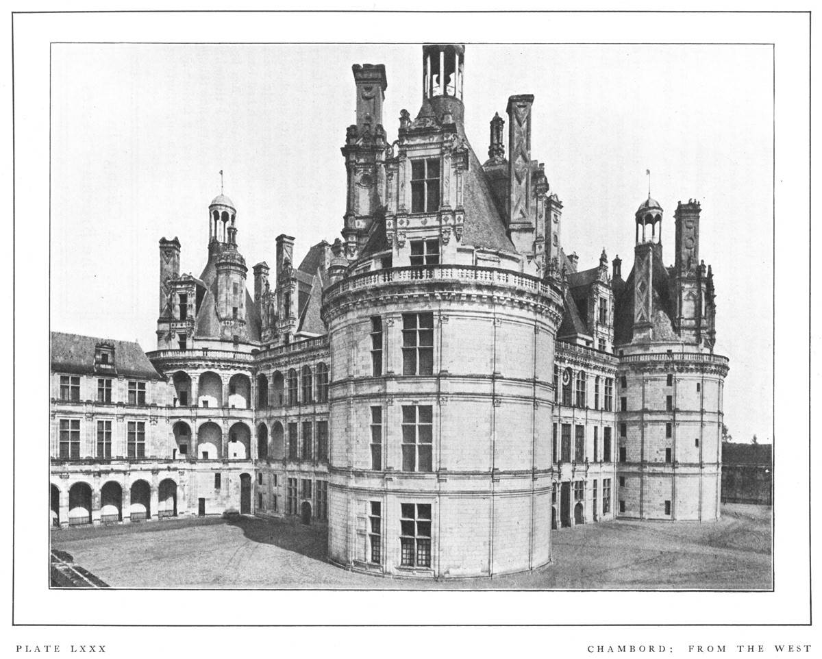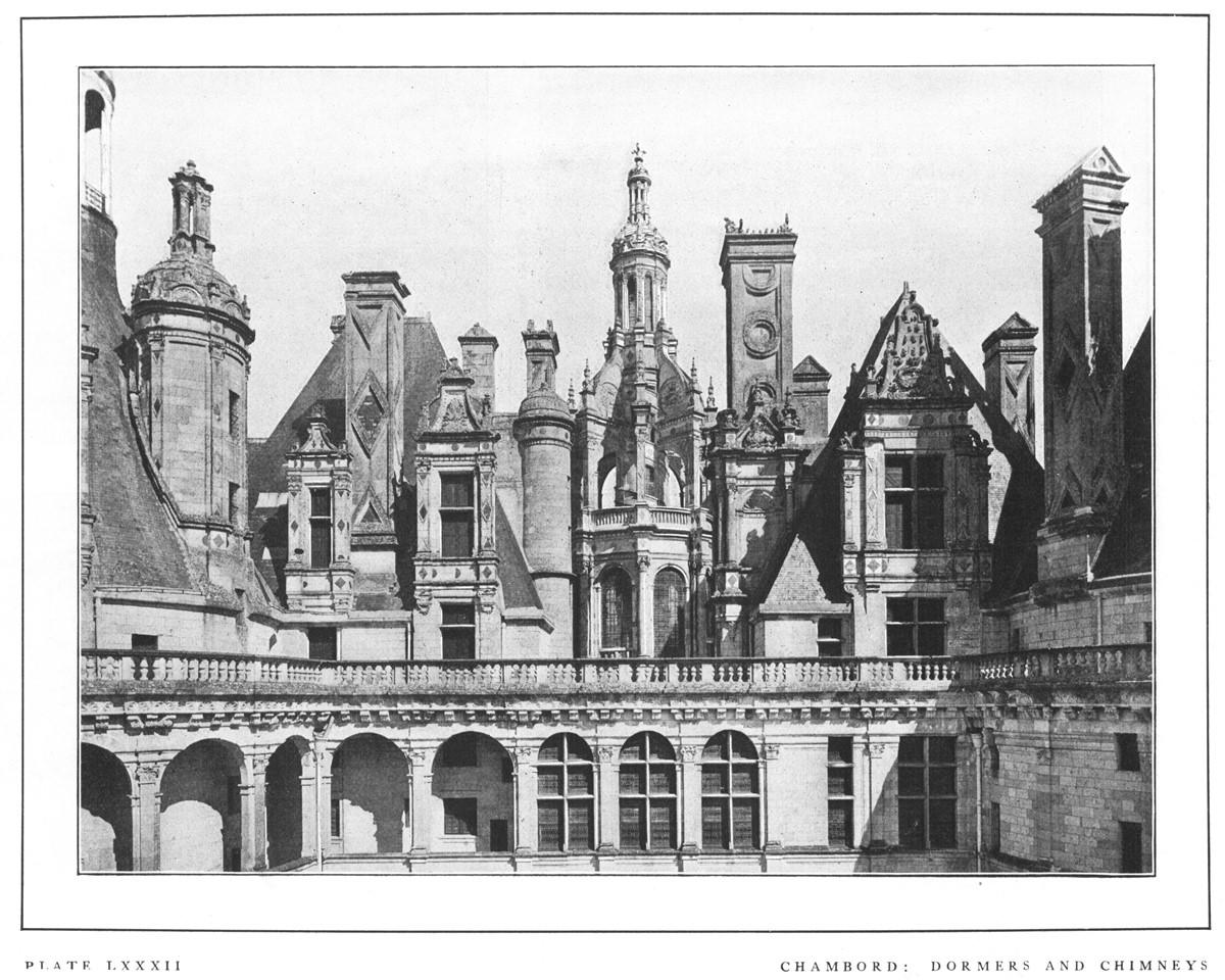 "Chambord is, indeed, throughout truly typical of the earlier stage of the new Renaissance movement. In the general arrangement, in the ordonnance, late Gothic caprice and fantastic love of the unforeseen rule triumphant. The older portions of the Château, the seemingly irregular assemblages of half Oriental turrets and spires, are debased Gothic, full of audacious disregard of all outward seeming of order. The architect, instead of seeking to bring home to the eye the general law, the plan on which the whole is grouped, has wilfully obscured and concealed it beneath the obviousness of the wild and daring conceits heaped above.