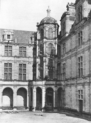 "At Chambord," writes Mrs. Pattison, in her Renaissance of Art in France, "which was building in 1526, the stories are, it is true, forcibly indicated, but the whole building is pulled together in Gothic fashion by the towers of the corps de logis, and by those which flank the pavilions or wings which stretch out on either side of the main body. In a building of the size of Chambord the result of this treatment is hardly satisfactory, for the lines of the wings to right and left of the main body seem to droop away from the heavy towers on either side. Inside the court, however, the unpleasant effect, even at Chambord, disappears, for the apparent length of the wings is greatly abbreviated by the effect of the two spiral staircases which run up outside the building at the internal angles on opposite sides.