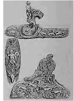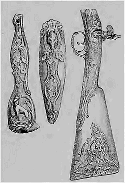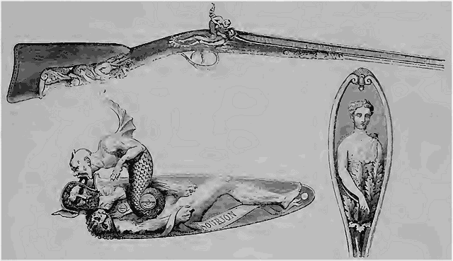 La crosse du fusil, donné en cadeau à un prince de Bavière, présentait un bas-relief dont le sujet était une bacchanale; les chiens, la platine, la sous-garde, s'étaient transformés en autant de figures de ronde-bosse délicatement sculptées et fouillées avec une persévérance et un art étonnant, dans le bois et dans le métal.