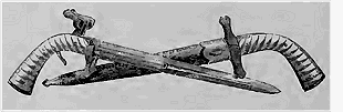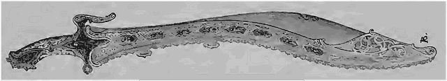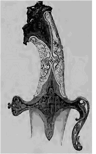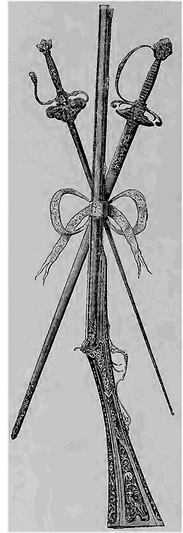 La petite épée de cour, également en fer ciselé et or, est plus conforme aux idées que nous venons d'énoncer. Une épée à la cour n'est qu'un ornement, un colifichet, et ne parle que de paix. Aussi sur cette épée, la Paix est assise tenant une corne d'abondance et éteignant le flambeau de la guerre. La Victoire la couvre de son bouclier; des chimères et des mascarons ornent le pommeau de ce joli jouet.