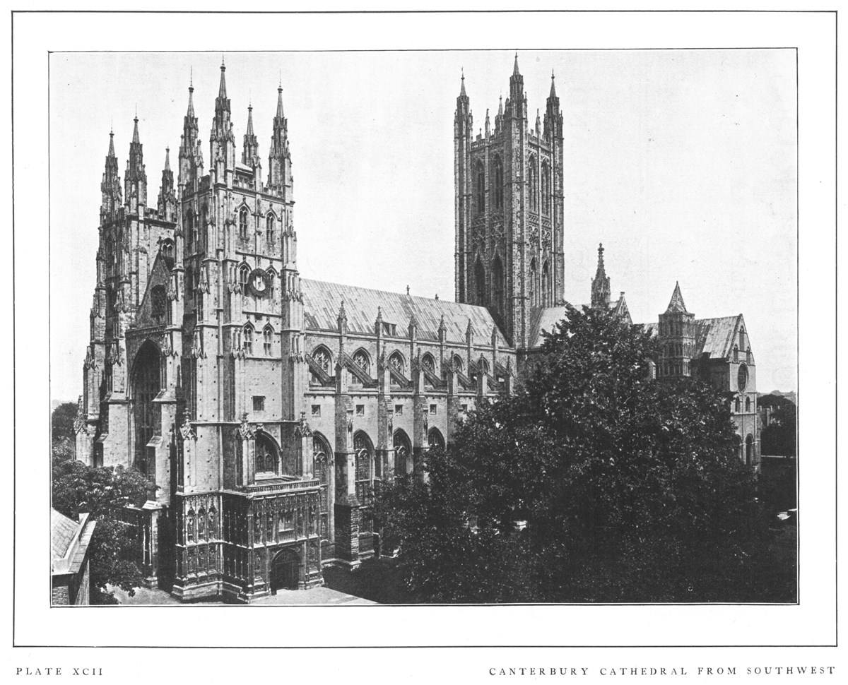 Canterbury Cathedral, the third church erected on the same site, represents English architectural history from 1070 to 1495; but its general external appearance is that of a magnificent building in the Perpendicular style. The present structure was begun by Laufranc, the first Norman architect, and was finished in 1130. The choir of this Norman cathedral was burned in 1174, and the present choir, in the Transitional style from Norman to Early English, was erected by William of Sens (who may almost be said to have introduced the Pointed style into England), and by his successor, William the Englishman (1174-1180). The old Norman nave and transepts remained intact for two hundred years more, when in 1378-1410 they were replaced by the present Perpendicular structure. The great central tower was added in 1495. The northwest tower is modern, the older tower having been pulled down, with doubtful wisdom, to make room for one to match its southwest neighbor. In spite of its huge proportions the interior of the nave produces a wonderful effect of lightness. The choir, one hundred and twenty feet long, is the longest in England. The great Norman arches, supported by circular and octagonal piers alternately, furnish a striking contrast to the inner portions of the nave.