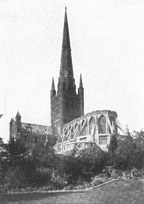 Litchfield Cathedral is sometimes styled the "Queen of English minsters," and, though surpassed by other cathedrals in age, size, grandeur of site and elaborate decoration, it has yet claim to the title because of the symmetry, proportion and picturesqueness of its general effect. It is built of red sandstone, and dates mainly from the thirteenth to the fourteenth centuries. The earliest structure on the present site was a Norman church dating from about 1100. The oldest part of the existing building is the lower part of the west half of the choir, erected about 1200. The transepts followed in 1220-40; the nave dates from 1250, and the west front from about 1280, while the Lady-Chapel belongs to the beginning of the fourteenth century. The cathedral close was formerly surrounded by a wall and moat; and in 1643 the cathedral was defended against the Puritans, who battered down the central tower and demolished many of the carvings, monuments and windows. It was, however, restored before the end of the century. The most conspicuous external features are the three beautiful spires and the fine west façade. This façade is one of the most graceful and harmonious in England; and it has the advantage over such a front as that of Peterborough in its organic connection with the rest of the building. It is covered with niches for about one hundred statues, almost all of which are now filled with modern carvings.