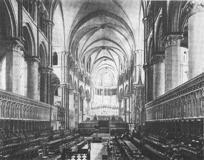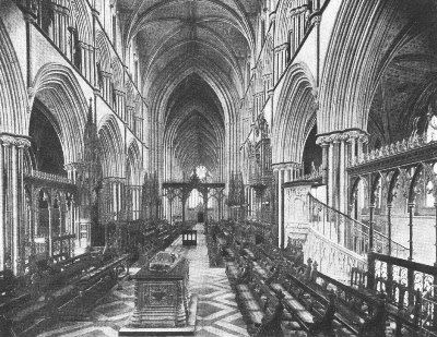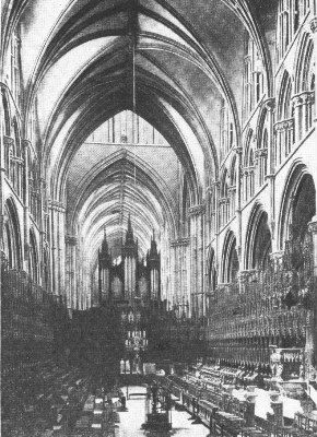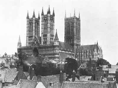 Lincoln Cathedral, splendidly crowning the hill on which the city is built, may perhaps claim to be the finest church in Great Britain. Other cathedrals equal or surpass it in certain points; but in the combination of size, delicacy of detail, effectiveness of both interior and exterior, good preservation and grandeur of position, it has probably no rival. Of the original cathedral, built at the end of the eleventh century, the tower, a portion of the west front, and part of first bay of the nave remain. The Norman cathedral was injured by an earthquake in 1185, and its restoration was at once undertaken by Bishop Hugh, called "St. Hugh of Lincoln" (1186-1200), who finished the choir and east transepts—the earliest piece of Early English work of known date. The west transepts and chapter-house were completed soon after, and the nave, including the west front, by about 1250. The upper story of the central tower, which dates from about 1240-50, was added between 1300 and 1320. The upper parts of the west towers are late Decorated, dating from about 1380. Among the more noteworthy external features are the fine central and west towers, and the west façade, in spite of its mixture of styles and the fact that it is in some degree merely a screen. The choir of the interior is the oldest known example of the Early English style, and is separated from the nave by a decorated screen (1320) surmounted by the organ. Though the vaulting is too low the entire interior is harmonious and imposing.