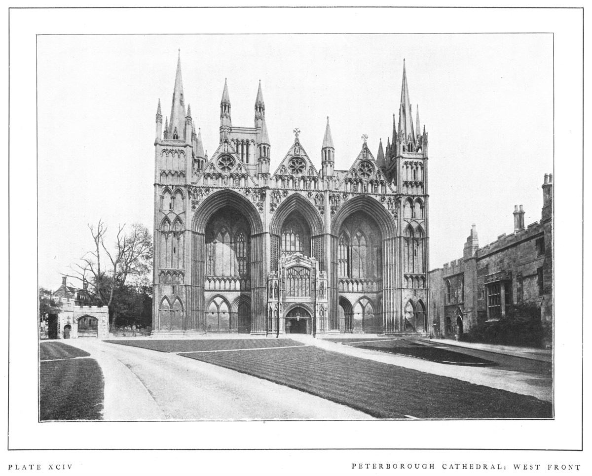 Peterborough Cathedral is one of the most important Norman churches left in England, though at first glance the exterior does not seem to bear out this assertion. The elaborate and somewhat foreign-looking west façade, with its recessed arches, gables and sculptures, is however an Early English addition of about 1220; and forms, as it were, a screen in front of the original west wall. The present building is the third church on this site. The first was destroyed by the Danes; the second was burned in 1116. The oldest part now standing is the choir, consecrated about 1140. The great transept dates from 1155-77, the late-Norman nave from 1177-93, and the west transepts, in the Transitional style, from 1193-1200. A series of uniform Decorated windows was added throughout the church in the fourteenth century. The spires and pinnacles of the flanking turrets of the west façade are of the Decorated and Perpendicular periods. The interior gives an impression of unusual lightness for Norman architecture, an effect enhanced by the color of the stone. In 1643 it suffered severely at the hands of the iconoclastic Puritans. The clearstory and triforium of the nave are impressive in size and effect. The painted wooden ceiling dates from the twelfth century.