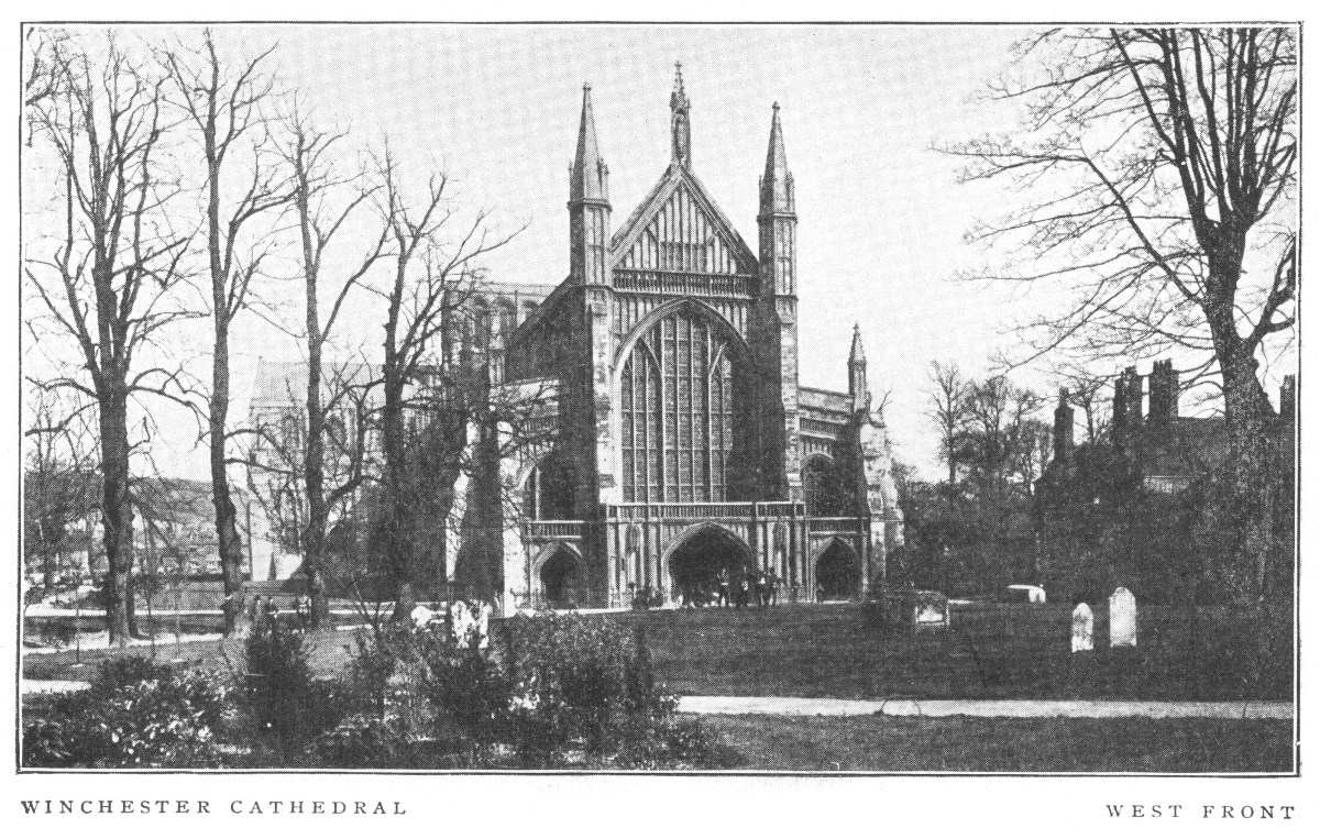 Winchester Cathedral is a stately edifice, incorporating every style of English architecture from the Norman to the Perpendicular. It was founded on a more ancient site in 1079. The choir and transepts were finished in 1093. The conversion of the nave from Norman to Perpendicular was begun by Bishop Edington before 1366, and the whole was completed in 1486. The builder of the greater part of the nave was Bishop William of Wickham, the renowned architect and statesman, who occupied the See from 1366 to 1404. The church is the longest in England, measuring 560 feet in all. The west façade, with its spacious portal, was begun in 1350, finished in the fifteenth century, and restored in 1860.