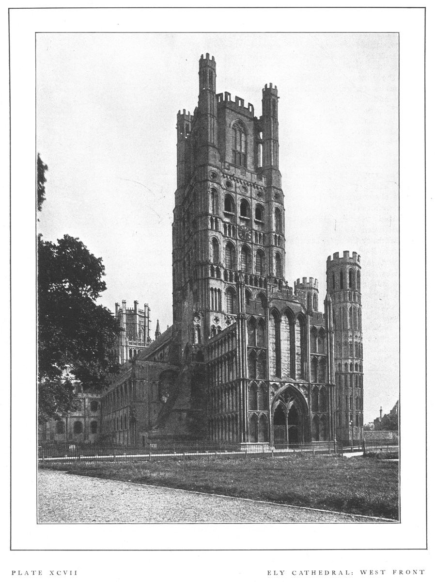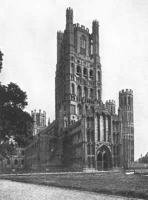 Ely Cathedral is architecturally one of the most interesting in England. It occupies the site of an abbey founded by St. Ethelreda in 673. The existing building was begun in 1083 by the first Norman abbot, and the last half at least was completed in its original form when the see of Ely was created in 1109. The west part of the nave, including the west tower, was finished about 1180, and the west porch was added before 1215. The east end was added between 1229 and 1254. The central tower, which belonged to the original church, fell in 1322, and advantage was taken of this opportunity to construct the beautiful decorated octagon. A new spire was erected on the west tower at the end of the fourteenth century, the weight of which may have caused the collapse of the northwest transept, though some authorities think the latter was never finished. The whole building has been carefully restored. The most striking feature of the edifice is the castellated west tower, which is unlike any other cathedral tower in England, and to some extent suggests military rather than ecclesiastical architecture. The greater part of this tower is Transitional Norman (117-489), but the octagonal top and turrets were added in the decorated period.